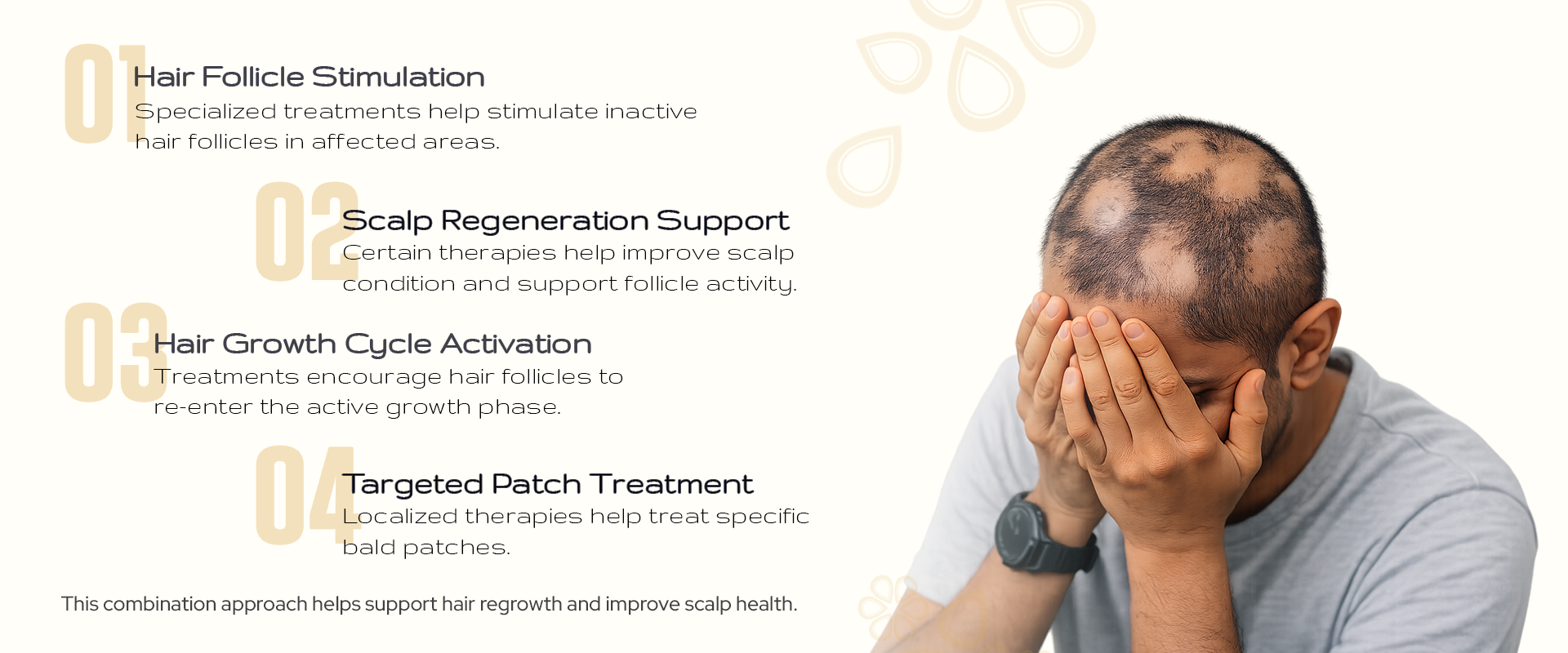 If you are experiencing patchy hair loss due to alopecia areata, professional anti baldness therapy can help stimulate hair follicles and support hair regrowth.
