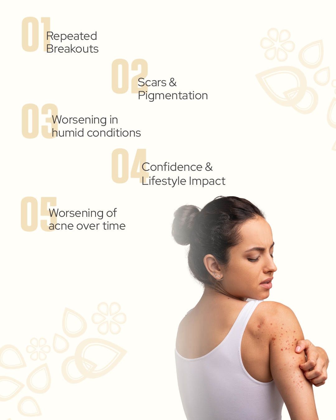 When left untreated, body acne tends to become chronic—appearing again and again on the back, shoulders, and chest. These recurring breakouts may turn into painful nodules or pus-filled boils, making the skin more inflamed and harder to manage.